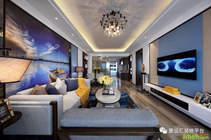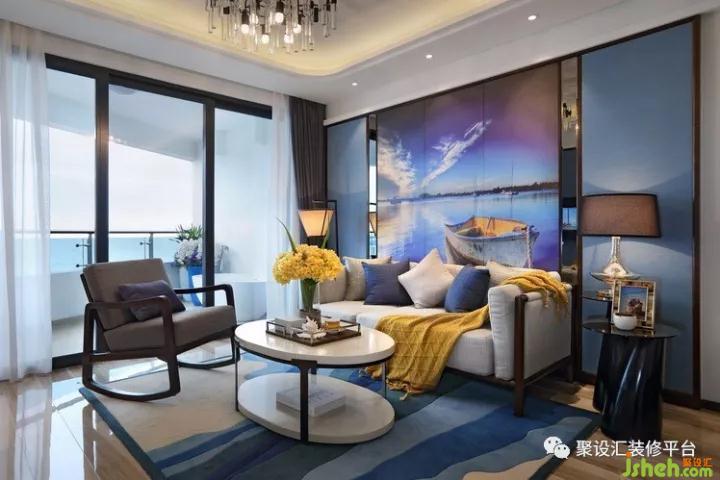 在別墅裝修設(shè)計(jì)中客廳設(shè)計(jì)中設(shè)計(jì)師試著借用海洋藍(lán)的對(duì)比色檸檬色作為空間的跳躍色,為空間注入富有活力的情緒,形成理性與感性的交織,使整個(gè)空間飽滿而豐富,再以紋理大氣的胡桃木搭配皮革、棉麻,形塑出自由溫暖的生活態(tài)度。