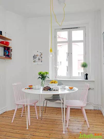 編輯點(diǎn)評(píng):在全方位的落地窗的映襯下,小小的餐廳不僅采光好,而且看起來(lái)開(kāi)闊明亮,整體白色的餐桌和餐椅讓這份明亮貫穿到底。