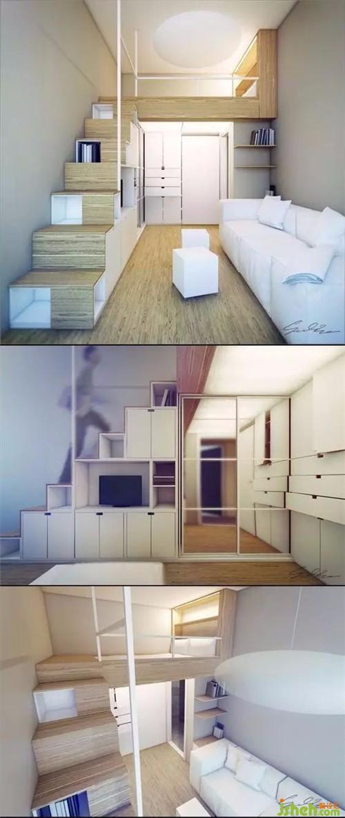 既然床占地方,那么室內(nèi)設(shè)計(jì)師需利用好縱向空間。把床設(shè)在二樓,搭個(gè)小梯子,樓梯恰好可以作為儲(chǔ)存柜使用,兩全其美!這樣一來,家里想有二樓其實(shí)不難嘛~~